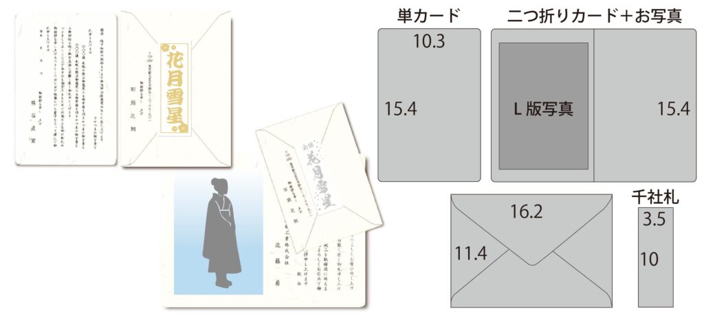- 二つ折りカード:用紙(154×206㎜)/封筒(162×114㎜)/千社札(100×35mm)