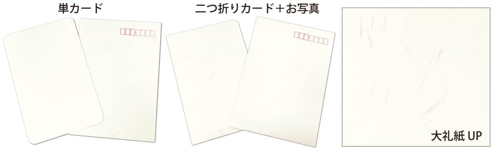 - カード:大礼紙(定番の和紙のイメージで、羽のように見える特殊な繊維がちりばめられた高級感ある用紙。冠婚葬祭や礼状などのフォーマルな場にも使われる格調高い和紙)